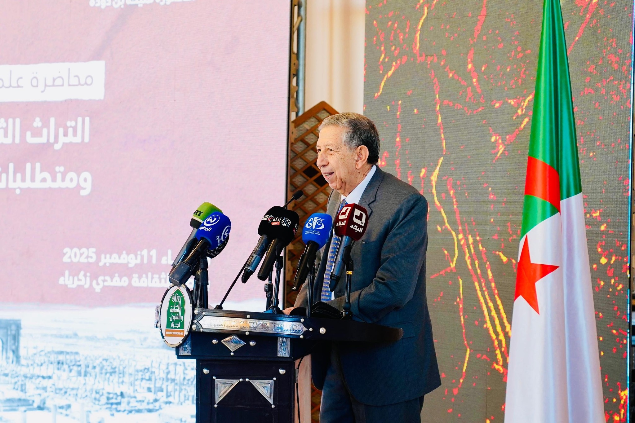 بعد ذلك، قدم البروفيسور منير بوشناقي محاضرة استعرض فيها الإطار الدولي لحماية الممتلكات الثقافية وتجارب الجزائر في التصدي للاتجار غير المشروع بالتراث، مع تسليط الضوء على جهود البلاد الرائدة في صون التراث المادي واللامادي ضمن المنظومة الأممية.
