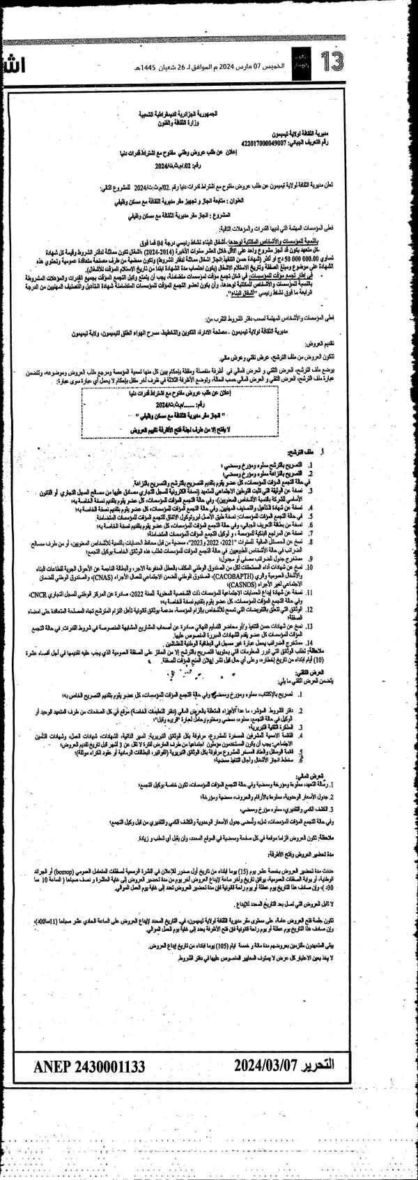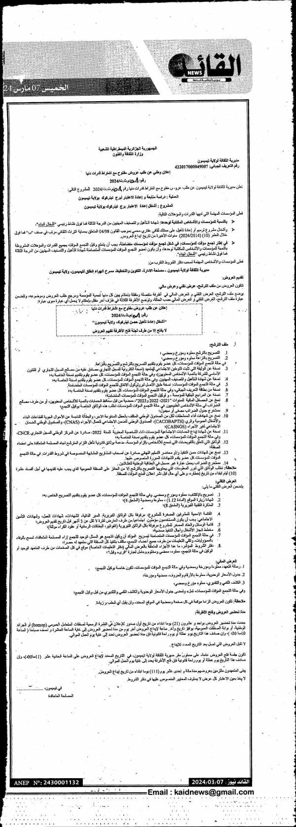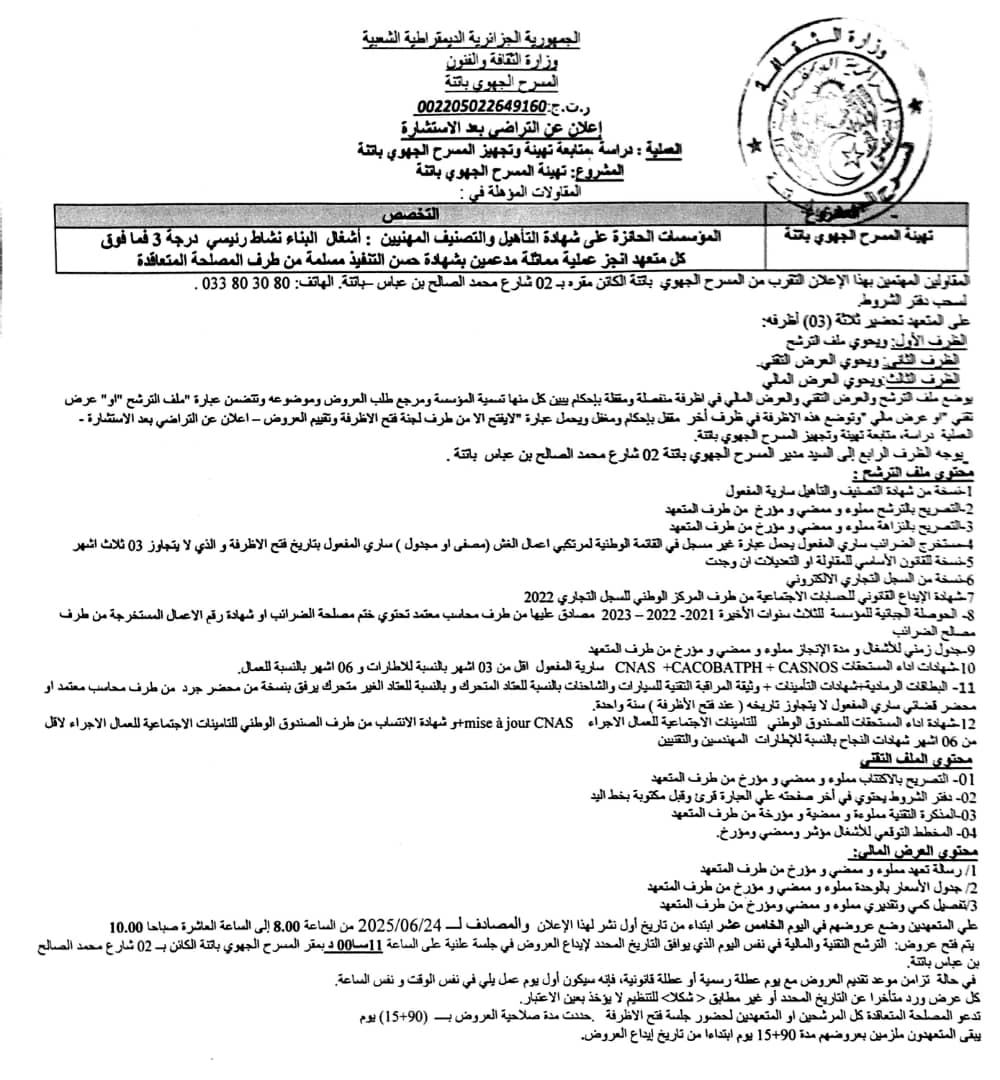 اعلان عن فتح استشارة رقم 001/2021 خاصة بأمن وحراسة مقر المتحف العمومي الوطني للزخرفة والمنمنمات وفن الخط (قصر مصطفى باشا) لسنة 2022 برقم 12 شارع الاخوة مشري القصبة السفلى بلدية القصبة) |