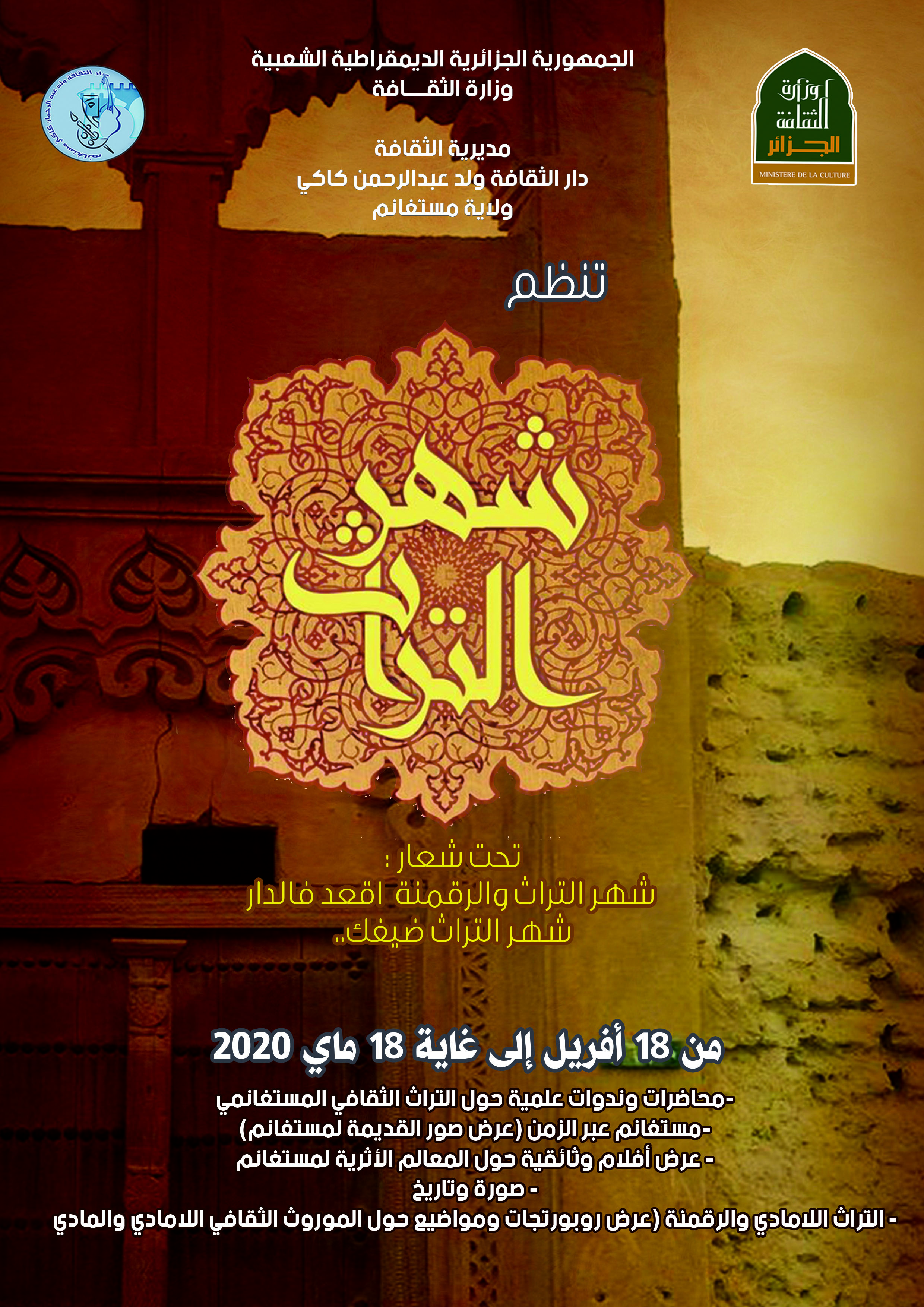 ندوات علمية ونشاطات وزيارات افتراضية تنظمها دار الثقافة لولاية مستغانم في إطار شهر التراث الذي انطلق اليوم السبت 18 أبريل 2020 على أن يستمر إلى 18 ماي المقبل