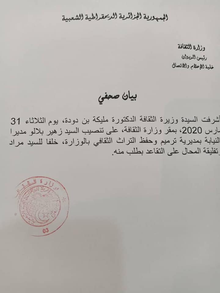 تنصيب السيد بلالو زهير مديرا بالنيابة على راس مديرية ترميم وحفظ التراث