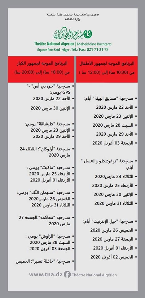عروض المسرح الوطني الجزائري ليوم غد الأربعاء 01 أفريل 2020