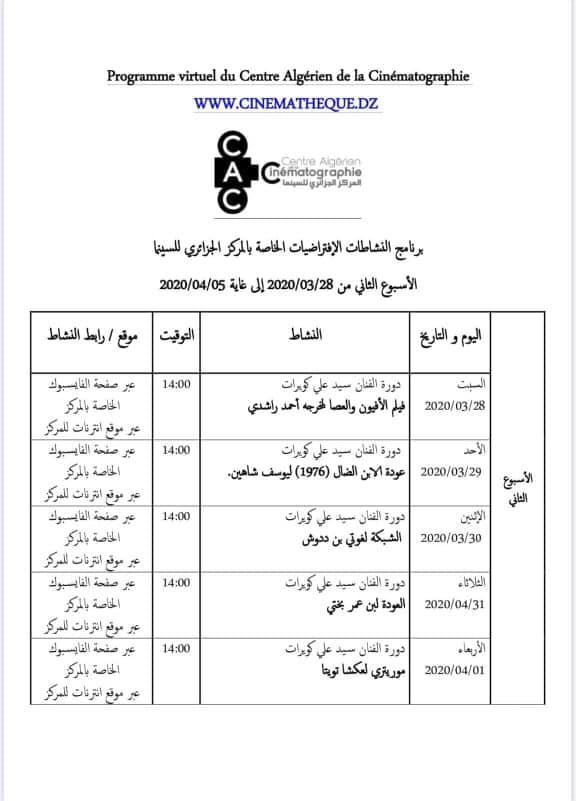 برنامج النشاطات الإفتراضية الخاصة بالمركز الجزائري للسينما الأسبوع الثاني من 28مارس 2020 إلى غاية 05 أفريل2020