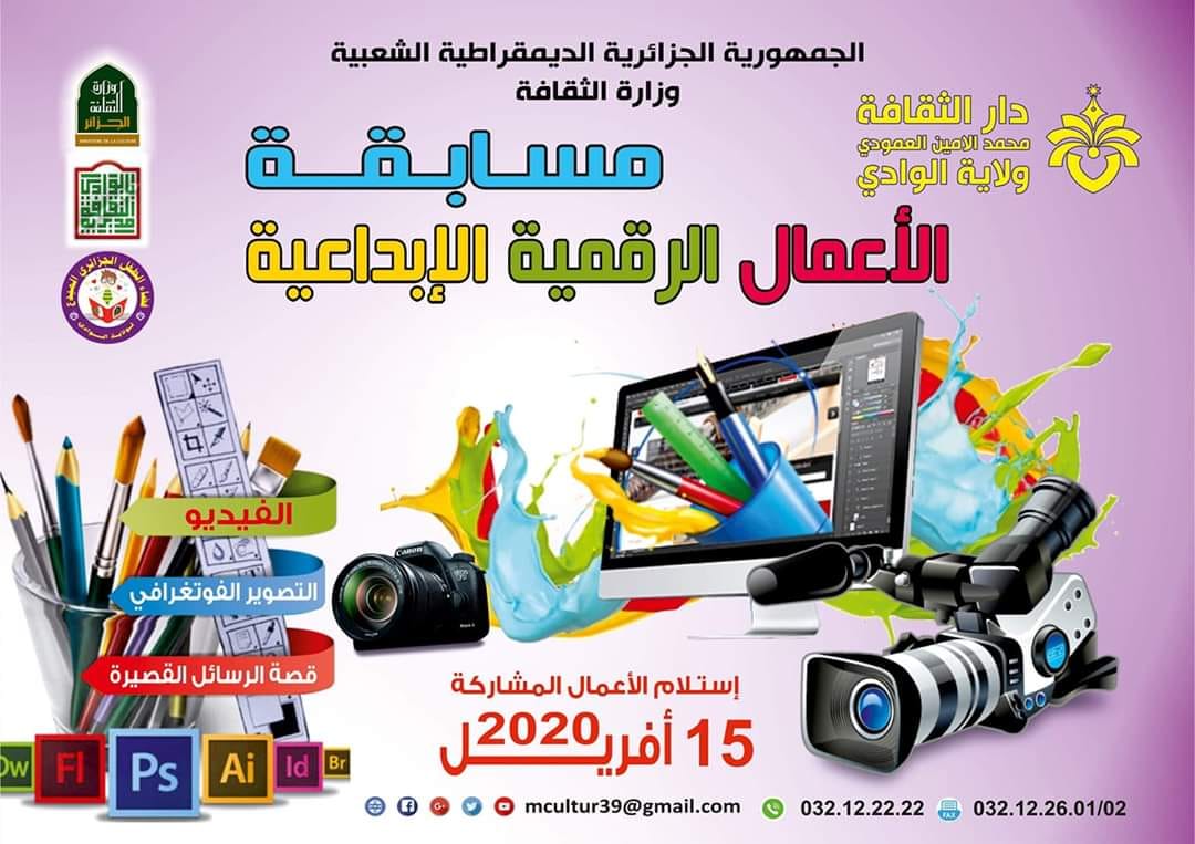 La maison de la culture Mohamed El Amben vertical de la wilaya d'el oued annonce l'ouverture des inscriptions pour participer au concours numériques créatifs qui nécessite la production d'un travail numérique créative qui représente et donne une forme au projet